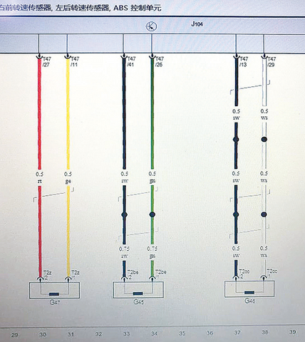 Restructure the troubleshooting procedure. This error is caused by a failure of an electrical circuit rather than by faulty signals, which is common. The crucial line maintenance measures appear to have been overlooked. The right front wheel of this car has a reasonably simple line connection. There are two black and two green sensors on the sensor. The pins are attached to the ABS control unit's 41st and 26th pins, respectively. Figure 2 depicts the circuit diagram.