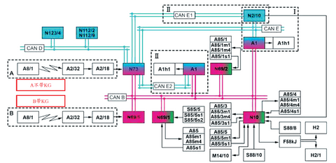 The lock function is simplified to understand that when the unlock or lock button on the remote-control key is pressed, the key sends the wireless signal to the rear window amplifier A2/32 antenna and the radio frequency modulation, the central locking system antenna A2/18 antenna amplifier. The keyless control unit N69/5 and then the keyless control unit N69/5 send radio signals to the electronic ignition switch N73 via the in-car CAN. N73 detects the authorization code and assumes it is valid. The electronic ignition switch will send the lock or unlock signal to the corresponding door module and the front signal actuation control module SAM through the in-car CAN, to perform each corresponding motor work to lock or unlock. See the functional schematic diagram for the specific working logic, as shown in Figure 2.