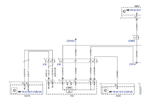 It can be seen from the figure that the F63 is triggered by the SRS control unit, and the 30t power supply is sent to the on-board electrical appliances after passing through the fuse, such as supplying power to A100 and outputting through Z241/5z1. Measure the continuity of the two lines from N2/10 to F63 explosive fuse. The resistance of the two wires is above 2.40MΩ, which is abnormal, indicating that the wires are open.