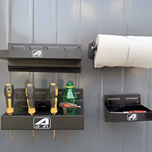 Heavy duty Magnetic Shelves, Caddy and Paper Towel Holder firmly attach to your toolbox, cabinet, locker, or any ferrous surface. Mount to the side of a car or your tool box for portable repairs.