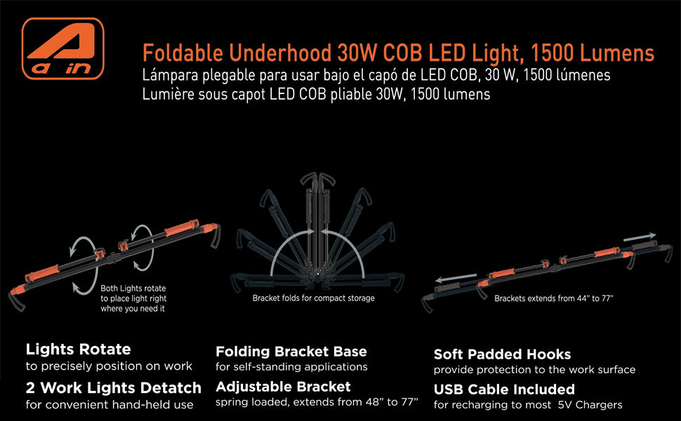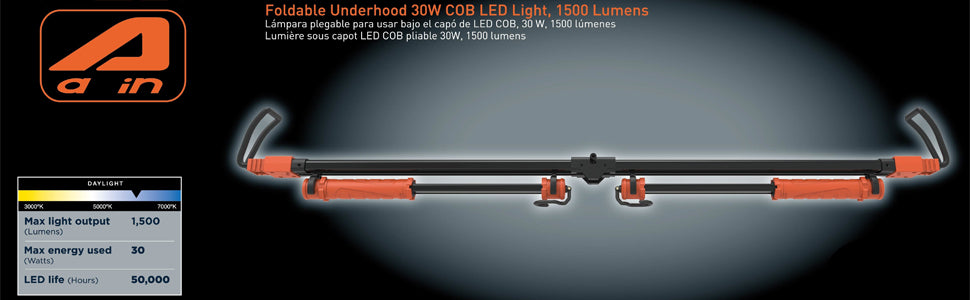- SUPER BRIGHT: Utilize COB (Chip on Board) LED Technology, 1500 Lumens and 40 SMD LEDs enable you to illuminate the whole engine bay at once. 360 degree folding underhood work light features a rechargeable lithium ion battery for convenient lighting.