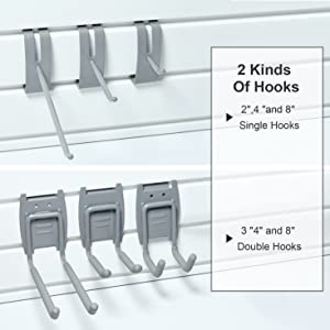 - 【Slat Wall Panel Kit includes】: 2 wall panels, mounting hardware includes: 6 pc Powder Coated Steel Hook Set. 3 Double Hooks with PVC covered ends to protect your items, sizes 3",4",8". 3 Single Hooks without PVC covers, sizes 2", 4", 8".